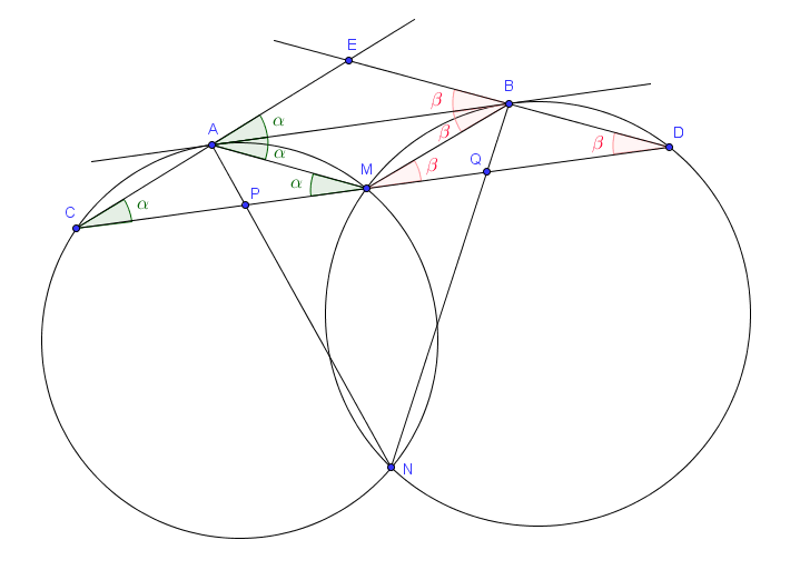 - $\widehat{BAM} = \widehat{ACM} = \alpha$ car il s'agit d'angles inscrit et tangentiel interceptant le même arc,