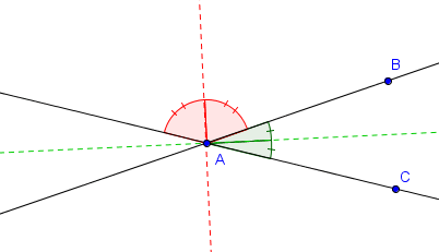 On définit généralement la bissectrice d'un angle comme étant la droite coupant cet angle en deux. En fait, on peut dire que la bissectrice de l'angle $\widehat{BAC}$ est le lieu des points situés à égale distance de la droite $AB$ et de la droite $AC$, mais cela donne lieu à un phénomène légèrement différent. En effet, ce lieu ainsi défini consiste en fait en deux droites et non une, comme l'indique la figure suivante. Ces deux droites sont perpendiculaires. La droite dessinée en vert est appelée