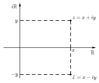 Puisque le conjugué de $z = x+iy$ est $\bar z = x-iy$, il s'agit géométriquement du point symétrique à $z$ par rapport à l'axe des abscisses, comme sur la figure suivante.
