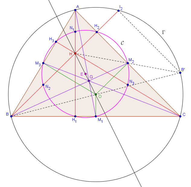 Enfin, notons $I_2$ la deuxième intersection de $BH$ avec $\Gamma$. Comme $[BB']$ est un diamètre de $\Gamma$, le triangle $BI_2B'$ est rectangle en $I_2$. Il s'ensuit que $B'I_2$ est parallèle à $AC$. Comme $M_2$ est le milieu de $[B'H]$, cela signifie que $[M_2H_2]$ est le segment joignant les milieux de deux côtés du triangle $HB'I_2$ et donc en particulier que $H_2$ est le milieu de $[HI_2]$. Les symétriques de l'orthocentre par rapport aux côtés se trouvent donc tous sur $\Gamma$, ce qui est à nouveau un résultat remarquable $(3)$. L'image de $I_2$ par $h_H$ est donc exactement $H_2$, et cela implique que $H_2 \in \mathcal{C}$. De la même manière, on trouve que $H_1$ et $H_3$ se situent sur $\mathcal{C}$.