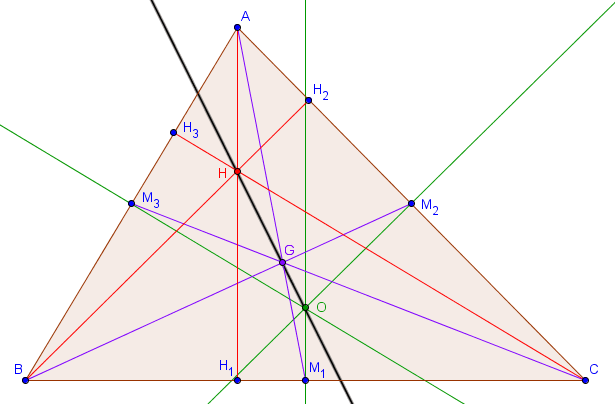 Dans un triangle $ABC$, les quatre points particuliers les plus fréquemment étudiés sont le centre du cercle circonscrit $O$, le centre du cercle inscrit $I$, l'orthocentre $H$ et le centre de gravité $G$. Il s'avère en fait que les points $O$, $H$ et $G$ sont toujours alignés, et la droite qu'ils forment s'appelle la