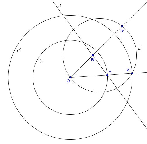 Pour bien comprendre la notion d'inversion, observons un exemple. Sur la figure suivante, nous considérons l'inversion de centre $O$ envoyant $A$ sur $A'$. Le cercle $\mathcal{C}$ de centre $O$ et passant par $A$ est alors logiquement envoyé sur le cercle $\mathcal{C'}$ de centre $O$ et passant par $A'$. L'image du point $B$ par l'inversion est notée $B'$. Puisque $B$ se situe à l'intérieur de $\mathcal{C}$, on a $|OB| < |OA|$. Il découle alors de la définition que $B'$ doit vérifier $|OB'| > |OA'|$. C'est pourquoi $B'$ se situe à l'extérieur de $\mathcal{C'}$. Le plus intéressant, sur cet exemple, est le cas de la droite $d = AB$. On sait que l'image de cette droite doit passer par $A'$ et par $B'$. D'autre part, les points de $d$ se situant très loin de $O$ doivent avoir pour image des points très proches de $O$. On dit souvent par abus de langage que "le point à l'infini est envoyé sur $O$" et réciproquement que "$O$ est envoyé sur le point à l'infini". Il est en fait possible de montrer rigoureusement que l'image de la droite $d$ est exactement le cercle $d'$ passant par $A'$, $B'$ et $O$.